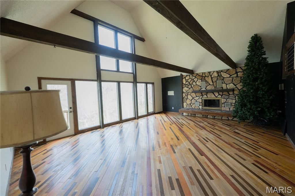 Welcome to this one-of-a-kind rustic retreat in the desirable Oak Hills subdivision of Lake St. Louis! This distinctive 4 bed, 2.5 bath home showcases a unique split-bedroom floor plan with incredible architectural character throughout. The stunning two-story great room features exposed wood beams, a wall of windows, and a cozy wood-burning fireplace, creating a warm and inviting atmosphere. The kitchen offers 42 custom cabinetry, custom tile backsplash, two pantries, and a bright breakfast room, all highlighted by real hardwood floors and beautiful Bavarian limestone flooring throughout.Upstairs, the private primary suite impresses with soaring 16' ceilings, a walk-in closet, and a recently remodeled en suite bath complete with a separate soaking tub and shower. A cozy loft area overlooks the main living space, perfect for a reading nook or home office. The lower level includes three additional bedrooms, a full bath, and a second wood-burning fireplace-ideal for guests or additional living space.Additional features include a large laundry room with utility sink and private side entry, cedar siding, covered front porch, and a 2-car attached garage. Roof replaced in 2022. This home offers incredible potential and is ready for your personal touch, including deck replacement. Don't miss the opportunity to make this truly unique property your own!